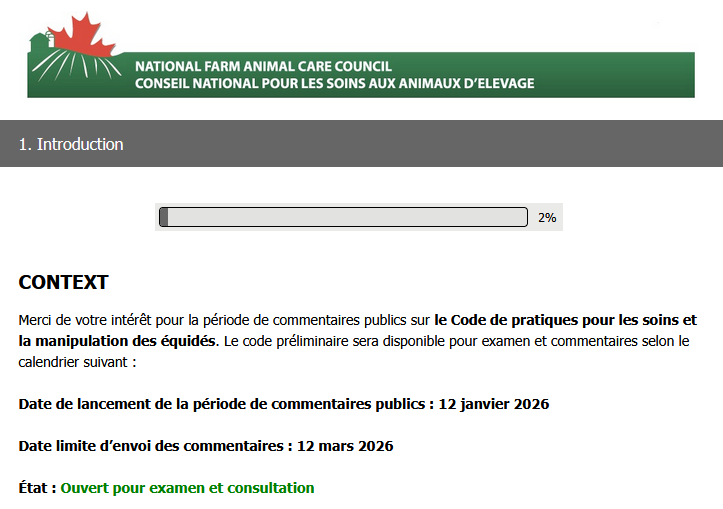 Mais le temps presse : il reste moins de 10 jours pour participer à la consultation publique et demander un Code réellement protecteur. BESA a donc participé à la consultation publique et invite toute personne sensible au bien-être des chevaux à faire entendre sa voix auprès du Conseil national pour les soins aux animaux d’élevage. Vous trouverez des suggestions de recommandations pour chaque section de la consultation à la fin de ce texte !