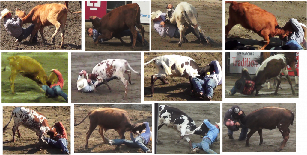 Composition de plusieurs photos prises au « Festival Western de Saint-Tite » en 2017, lors de « terrassements de bouvillons » – Droit Animalier Québec. On y voit la forte torsion du cou des animaux, presque complètement retourné.